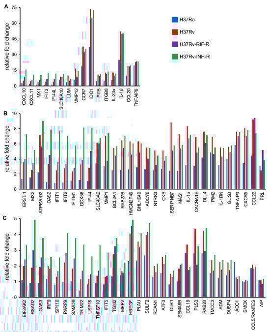 Fold change in the expression of DEGs in THP-1 cell lines infected with reference M. tuberculosis strains relative to mock-infected cells (24 h post-infection; p < 0.05). Representatives of different degrees of variation in gene expression are depicted in this figure. (A) Relative fold changes in gene expression above 10 are shown. (B) Relative fold changes in gene expression between 5 and 10 are shown. (C) Relative fold changes in gene expression between 1 and 5 are shown.