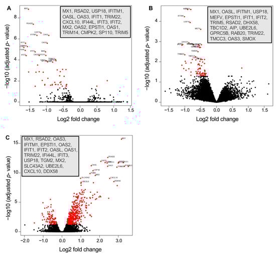 Volcano plots displaying differentially expressed genes in THP-1 cells in three different comparison groups (24 h post-infection; p < 0.05). The 20 most highly significant DEGs in each plot are indicated in the insets. These genes all indicate higher expression in H37Rv-INH-R-infected cells, relative to H37Rv- and H37Rv-RIF-R-infected cells. (A) H37Rv vs. H37Rv-INH-R. (B) H37Rv-RIF-R vs. H37Rv-INH-R. (C) H37Rv-INH-R vs. H37Ra.