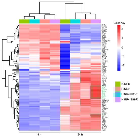 Heatmap and clustering across M. tuberculosis-infected THP-1 cells relative to mock-infected cells at 4 h and 24 h post-infection, using the top 100 most significant DEGs in cells infected with isoniazid-resistant H37Rv strain at 24 h post-infection. Samples with a relatively high expression of a given gene are shown in red, and samples with a relatively low expression are shown in blue. Lighter color shades and white indicate genes with intermediate expression levels. Some of the interferon-stimulated genes (ISGs) are marked in green, and their overexpression in cells infected with the isoniazid-resistant H37Rv strain is indicated with a green box in the plot.