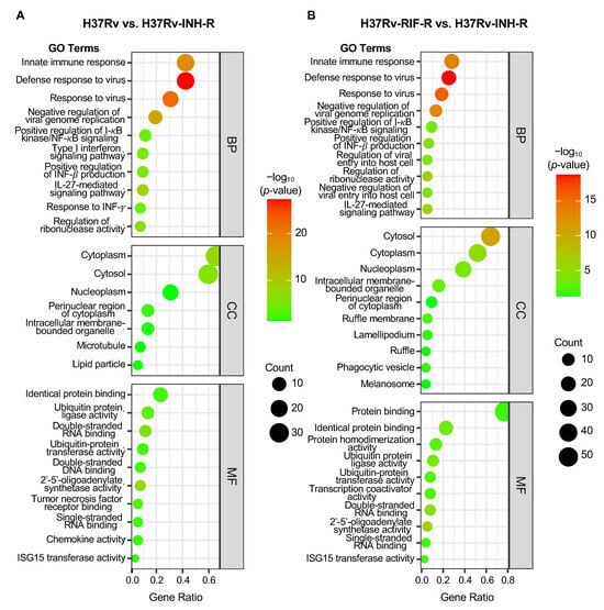 Bubble plot of GO enrichment analysis of up-regulated DEGs in cells infected with the isoniazid-resistant H37Rv strain (24 h post-infection; p < 0.05). All GO terms are grouped into three categories: biological process (BP), cellular component (CC), and molecular function (MF). (A) Comparison group: drug-sensitive H37Rv vs. isoniazid-resistant H37Rv. (B) Comparison group: rifampin-resistant H37Rv vs. isoniazid-resistant H37Rv.