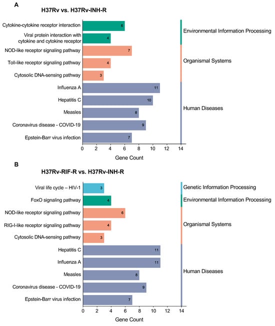 KEGG analysis of up-regulated DEGs in cells infected with the isoniazid-resistant H37Rv strain. The first ten enriched pathways at 24 h post-infection are shown (p < 0.05). The KEGG pathways were subsequently divided into three or four categories: environmental information processing, organismal systems, genetic information processing and human diseases. (A) Comparison group drug-sensitive H37Rv vs. isoniazid-resistant H37Rv. (B) Comparison group rifampin-resistant H37Rv vs. isoniazid-resistant H37Rv.