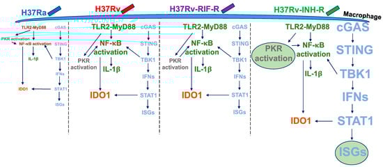 M. tuberculosis is remarkably successful at evading the host immune response [22]. This pathogen adopts several strategies to avoid clearance and persist in the host [23,24]. Macrophages play a crucial role in host defense against M. tuberculosis by promoting the activation of different signaling pathways [25,26]. In particular, cGAS, TBK1, and NF-κB are known to be strongly involved in the activation of the innate immunity by the release of many cytokines, such as IL-1β, and the expression of many interferon-stimulated genes (ISGs) [27,28]. Nevertheless, our understanding of the host–M. tuberculosis interactions is still limited, and many fundamental gaps in our knowledge remain in how these interactions may differ in response to distinct M. tuberculosis strains [29,30].