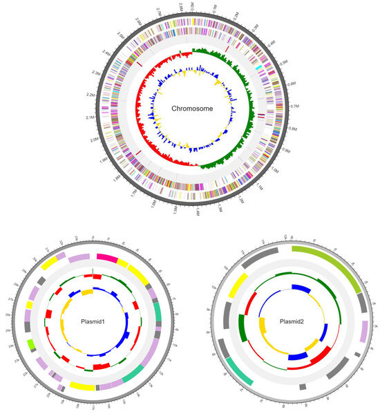 The genome assembly of SMB092 consists of a 2.849 Mbp circular chromosome, a 34.051 Kbp plasmid1, and a 11.636 Kbp plasmid2, as shown in Figure 1 and Table 2. The size of the entire genome sequence of SMB092 was 2,895,229 bp. The average G + C content of the whole genome was 46.3%. The GC content of each contig was 46.3% (chromosome), 39.2% (plasmid1), and 40.5% (plasmid2). Additionally, 2802 CDSs were identified in the total genome of SMB092, specifically 2754 CDSs for chromosome, 36 CDSs for plasmid1, and 12 CDSs for plasmid2. The SMB092 strain contained 59 tRNA and 15 rRNA genes.