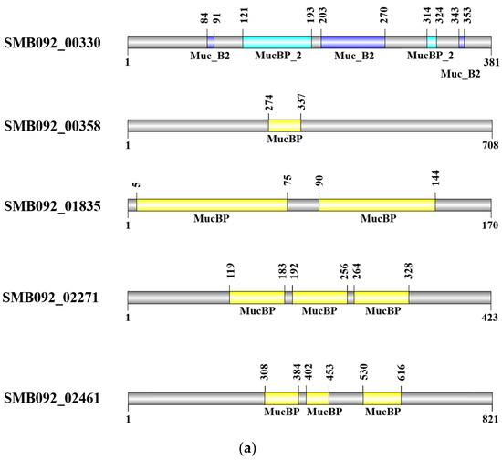 We searched for genes encoding for MuB proteins that allow SMB092 to bind to mucin (Figure 2a). Mucin-binding domain (MucBP_2), Muc B2-like domain (Muc_B2), and MucBP domain (MucBP) were searched for across all CDSs, and a total of 14 domains were identified in five CDSs from the chromosome—SMB092_00330, SMB092_00358, SMB092_01835, SMB092_02271, and SMB092_02461. Three Muc_B2 domains and two MucBP_2 domains were identified in SMB092_00330. SMB092_00358, SMB092_01835, SMB092_02271, and SMB092_02461 contained one, two, three, and three MucBPs, respectively. No MuB proteins were observed in CDSs from the plasmids. This indicates that SMB092 is likely to interact directly with a host via the mucin-binding protein domain.