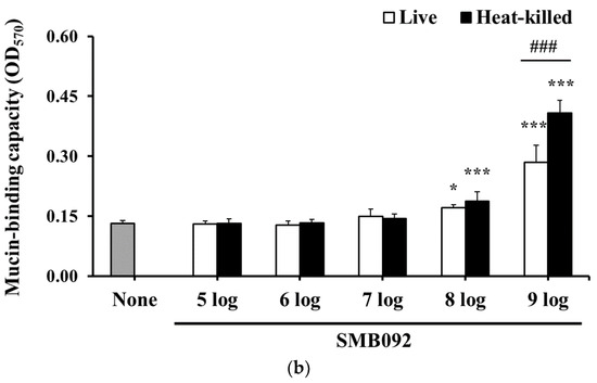 The results of in vitro adhesion to mucin studies are presented in Figure 2b. Viable and heat-killed SMB092 exhibited dose-dependent adhesion ability to mucin from bovine submaxillary glands. In particular, 109 cells/mL of heat-killed SMB092 showed higher binding activity than 109 CFU/mL of viable SMB092. These results indicate that SMB092 interacts with host cell mucins despite being inactivated by heat treatment.