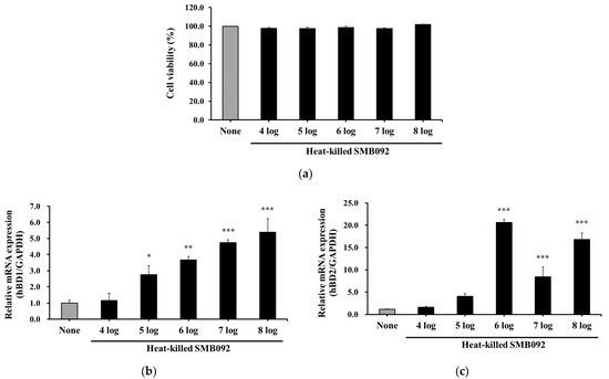 To investigate the safety and ability to express hBDs of heat-killed SMB092 for oral health, we utilized human primary normal oral keratinocytes (HOK-16B cells). The tested strain at concentrations below eight log cells/mL did not show any cytotoxicity in HOK-16B cells (Figure 3a); therefore, in subsequent experiments, the influence of cytotoxicity was not contemplated.
