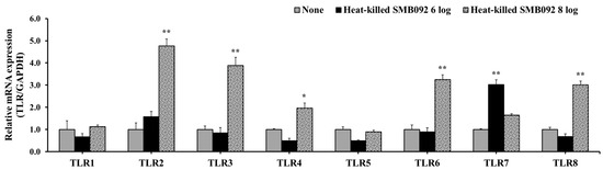 To examine the regulation of LTA-sensing receptors by heat-killed SMB092, we measured TLRs in HOK-16B cells. As shown in Figure 4, 108 cells/mL of heat-killed SMB092 significantly upregulated the expression of TLR2, TLR3, TLR4, TLR6, and TLR8. The data suggest that heat-killed SMB092 induces the expression of TLRs and LTA-sensing receptors.
