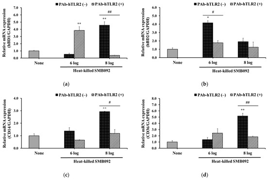 To verify the signaling pathway, the relative expression levels of hBD1/2 mRNA induced by heat-killed SMB092 were measured in HOK-16B cells treated with a TLR2-neutralizing antibody (Figure 5a,b). Compared to the condition without TLR2 neutralization, 108 cells/mL of heat-killed SMB092 decreased hBD1 expression. In the case of hBD2, mRNA expression levels were significantly reduced following treatment with the polyclonal antibody (PAb-hTLR2) in the six log heat-killed SMB092 group.