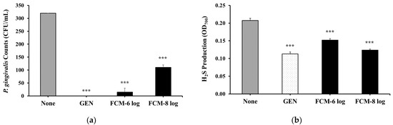 The inhibitory survival of P. gingivalis and the reduced production of H2S by the FCM. (a) Viability of P. gingivalis; (b) H2S production. *** p < 0.001 compared to none. None: Negative control.