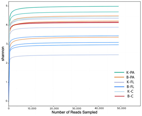 Rarefaction curves for different sample groups. Note: K-PA: attached microorganisms in the water in the control group, B-PA: attached microorganisms in the water in the biofloc group, K-FL: planktonic microorganisms in the water in the control group, B-FL: planktonic microorganisms in the water in the biofloc group, K-C: gut microorganisms of largemouth bass in the control group, B-C: gut microorganisms of largemouth bass in the biofloc group; the same below.