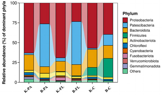 As shown in Figure 3, at the end of the culture, the relative abundances of Proteobacteria in the planktonic microorganisms in the water of the biofloc group and the control group were 23.50% and 69.13%, respectively. The proportions of Patescibacteria were 54.13% and 4.36%, respectively, while Bacteroidota accounted for 14.12% and 12.85%, respectively. Collectively, these three dominant phyla constituted 91.75% of the total planktonic microbial community in the biofloc group and 86.17% in the control group, underscoring their prominent roles within the microbial composition. Compared to the control group, the biofloc group exhibited a lower relative abundance of Proteobacteria but higher relative abundances of Patescibacteria and Bacteroidota. This indicates that, at the phylum level, while the compositions of the dominant phyla in the planktonic microbial communities of both groups were similar, the relative abundances of each phylum differed between the two groups.