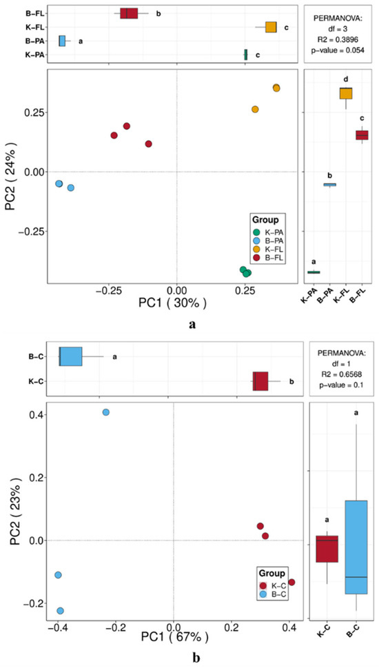 (a,b) PCoA analysis different samples based on Bray–Curtis distance. Note: the lowercase letters above and beside the boxes represent the significance test results of beta diversity distance differences between samples. Different letters indicate that the p-value of the difference test between groups is less than 0.05.