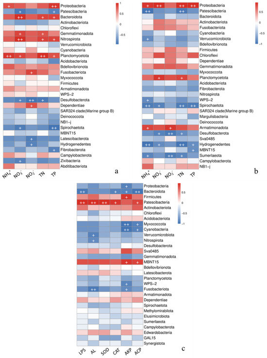 (a,b) Correlation analysis between the abundance of major species and environmental factors at the phylum level. (c) Correlation analysis between the abundance of major species and physiological factors at the phylum level. Note: “+” indicates that the p-value of the significance test of correlation analysis between the abundance of major species and environmental factors at the phylum level is less than 0.05. “++” indicates that the p-value l is less than 0.01; the same below.
