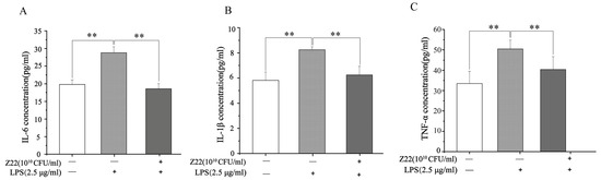 L. plantarum Z22 inhibits proinflammatory cytokine (IL-6, IL-1β, and TNF-α) secretion in LPS-induced RAW264.7 cells. The levels of IL-6 (A), IL-1β (B), and TNF-α (C) in supernatants of RAW264.7 cell culture (pretreated with the strain suspensions for 4 h and then stimulated with LPS for 12 h). Each group was repeated at least three times. Error bars, S.D.** means p < 0.01 compared to control group by one-way ANOVA.