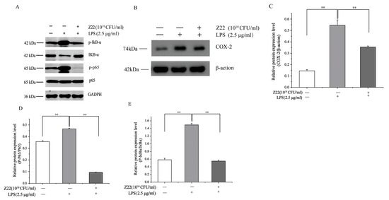 L. plantarum Z22 inhibits NF-κB activation and COX-2 expression in LPS-induced RAW 264.7 cells. (A) The protein expression (tested by the method of Western blotting) of p-IκB-α, IkB-α, p65, and p-p65 in cells treated with L. plantarum Z22 for 18 h. (B) The protein expression (tested by the method of Western blotting) of COX-2 from the cells treated with L. plantarum Z22 for 18 h. (C–E) Band densities were measured using Image J 1.54 software and subjected to statistical analysis. Note: Blank control: Untreated cells, Model group: The cells were treated with LPS only, Treatment group: The cells were treated with L. plantarum Z22 and LPS. Each group was repeated at least three times. ** Significant differences between the groups, p < 0.01.