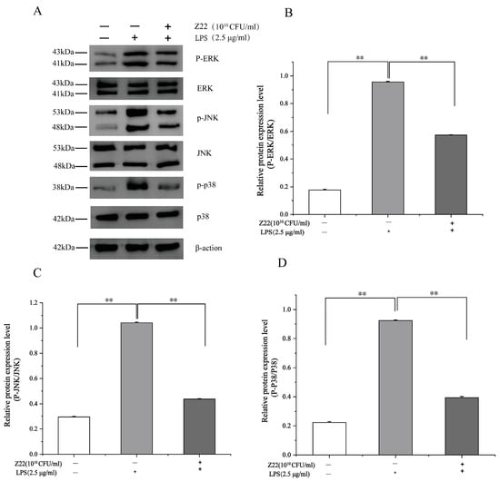 L. plantarum Z22 inhibits MAPK activation in RAW264.7 cells induced by LPS. (A) The protein expression (tested by the method of Western blotting) of p38, p-p38, JNK, p-JNK, ERK, and p-ERK from the cells treated with L. plantarum Z22 for 18 h. (B–D) Band densities were measured using Image J software and subjected to statistical analysis. Note: Blank control: Untreated cells, Model group: The cells were treated with LPS only, Treatment group: The cells were treated with L. plantarum Z22 and LPS. Each group was repeated at least three times. ** Significant differences between the groups, p < 0.01.