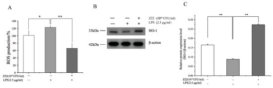 ROS are byproducts of aerobic metabolism and can induce a series of inflammatory responses when overexpressed. HO-1 is a multifunctional regulator of oxidative-stress-related diseases, which can protect cells from oxidative damage. However, a high expression of HO-1 inhibits LPS-induced ROS production, thereby preventing oxidative damage in cells, regulating inflammation, and regulating apoptosis. To determine the antioxidant activity, ROS production and HO-1 protein expression were measured in LPS-induced RAW264.7 cells. As shown in Figure 4A, treatment with LPS significantly increased the production of ROS (100.82%), in contrast to the control (122.60%). Nevertheless, pre-treatment with L. plantarum Z22 inhibited ROS production to 65.99%. Meanwhile, the treatment of this strain also increased the expression of HO-1 (Figure 4B,C). Some research has reported that the high expression of HO-1 inhibited LPS-induced ROS production, leading to a reduction in pro-inflammatory cytokine levels in RAW264.7 mouse macrophages [63]. Thus, the results from this study might indicate that L. plantarum Z22 has antioxidant capacity.