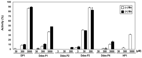 ABTS radical-scavenging activity of synthetic peptides from D. deserti. Peptides were tested in the presence or absence of 1 mM MnCl2 and incubated with the ABTS solution for 5 min. The graph shows the ABTS radical neutralization capabilities. For reference, previously identified AOPs, DP1 and HP1, were included. Values represent means ± SD from duplicate experiments.
