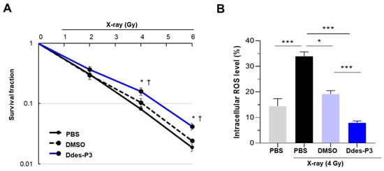 Radioprotective effects of Ddes-P3 on CHO-K1 cells. (A) CHO-K1 cells were pretreated with Ddes-P3 (30 µM), DMSO (0.3%, final concentration), and PBS for 2 h then subjected to radiation (2, 4, and 6 Gy). Cell survival was quantified 7 days post-irradiation using a clonogenic assay. Data points represent mean survival fractions, calculated from six replicates across three independent experiments. Statistical significance was determined using Student’s two-tailed t-test: * p < 0.05 compared to PBS-treated cells post-radiation; † p < 0.02 compared to DMSO-treated cells post-radiation. (B) Intracellular ROS production in CHO-K1 cells was analyzed by using DCHF-DA labeling. Cells underwent pretreatment with PBS, 0.3% DMSO, or 30 µM Ddes-P3 for 4 h, followed by a 4 Gy irradiation. Post-irradiation, the cells were subjected to flow cytometry analysis. The bar graph represents the mean ± SD from three independent experiments. Statistical significance was evaluated using one-way ANOVA followed by Tukey’s post hoc test, with * p < 0.05 and *** p < 0.001 indicating significant differences from control.