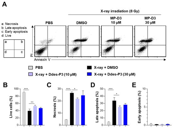 Inhibitory effects of Ddes-P3 on X-ray-induced apoptotic and necrotic cell death. CHO-K1 cells were pretreated with 10 or 30 µM Ddes-P3 for 3 h before X-ray irradiation. Non- and irradiated groups without Ddes-P3 were treated with PBS and 0.3% DMSO, respectively. After 24 h of X-ray irradiation, the cells were stained with an Annexin V/PI apoptosis detection kit and analyzed by flow cytometry. (A) Representative dot plot images from each group. (B) Live cells gated as Annexin V−PI− cells. (C) Necrotic cells gated as Annexin V−PI+ cells. (D) Late apoptotic cells gated as Annexin V+PI+ cells. (E) Early apoptotic cells gated as Annexin V+PI− cells. Bar graphs are expressed as mean ± SD of three independent experiments. Statistics were analyzed using one-way ANOVA with Tukey’s post hoc test. * p < 0.05, ** p < 0.01, or *** p < 0.001.
