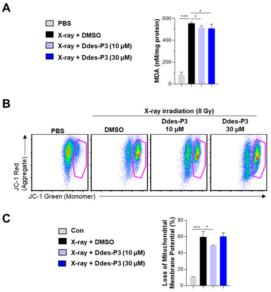Inhibitory effects of Ddes-P3 on X-ray-induced MDA accumulation and MMP loss. CHO-K1 cells were pretreated with 10 or 30 µM Ddes-P3 for 3 h before X-ray irradiation. Non- and irradiated groups without Ddes-P3 were treated with PBS and 0.3% DMSO, respectively. (A) After 24 h of X-ray irradiation, three wells in each group were pooled, and the cells were homogenized with MDA lysis buffer. Level of MDA in cell lysates were measured by colorimetric MDA assay kit. (B,C) The cells were harvested by 0.25% trypsin-EDTA after 24 h of irradiation and stained with JC-1 dye for 15 min at 37 °C in a 5% CO2. The stained cells were analyzed by flow cytometry. (B) The representative dot plot images from each group. The pink lines outline the populations exhibiting mitochondrial membrane depolarization, indicative of mitochondrial damage. (C) The bar graph showing the percentage of MMP loss, expressed as mean ± SD of three independent experiments. Statistics were analyzed using one-way ANOVA with Tukey’s post hoc test. * p < 0.05 or *** p < 0.001.