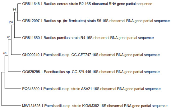 Two promising strains, ASA21 and ASA29, were identified by sequencing their 16S ribosomal rRNA genes. Bacterial genomic DNA was extracted using a commercial DNA extraction kit following the manufacturer’s instructions. The 16S rDNA region was amplified by PCR using universal primers 27F (5′-AGAGTTTGATCCTGGCTCAG-3′) and 1492R (5′-GGTTACCTTGTTACGACTT-3′). The PCR conditions were set as follows: initial denaturation at 95 °C for 5 min, followed by 35 cycles of 95 °C for 30 s, 55 °C for 30 s, and 72 °C for 90 s, with a final extension at 72 °C for 7 min. The amplified products were purified and sequenced. The obtained sequences were compared against the NCBI GenBank database using the BLASTn tool to identify their closest relatives.