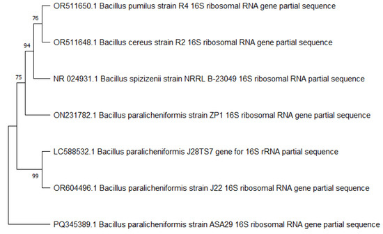 Strain ASA29 (accession number PQ345389.1) was identified as B. paralicheniformis. The nucleotide sequence of the 16S ribosomal RNA of this strain is given in Supplementary Table S2. Phylogenetic analysis revealed its close association with several strains of the same species including J28TS7, J22 and ZP1, which were isolated from Japanese honey, Pakistan honey and Serbia honey, respectively (Figure 2).