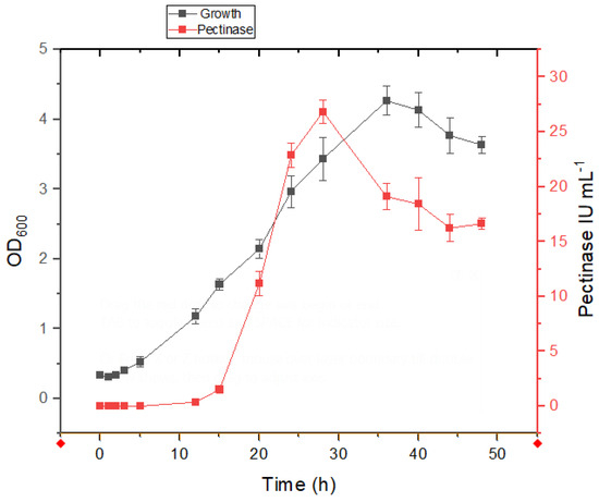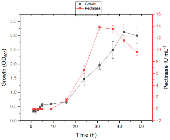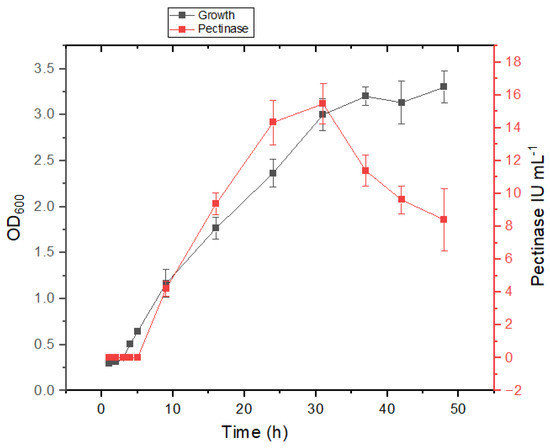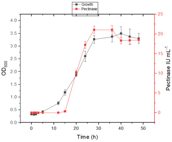 Strain ASA29 exhibited slightly different behavior, as pectinase production was delayed until the mid-log phase; however, it quickly reached its peak, producing more than 25 IU mL−1 in mineral salt medium containing 2.5% sodium chloride (Figure 5) and ~21 IU mL−1 in the absence of sodium chloride (Figure 6). Nonetheless, strain ASA29 demonstrated higher growth and pectinase titers than strain ASA21.