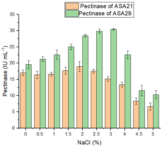 To investigate the impact of different concentrations of NaCl on the activity of the pectinase of strains ASA21 and ASA29, the crude enzyme preparations were dialyzed separately, and the IU mL−1 of pectinase was considered 100%. The varying salt concentrations were added separately to each preparation, and pectinase activity was determined. The pectinase activity of ASA21 was not enhanced by increasing the salt concentrations in the reaction mixture, although it tolerated up to 2.5–3% of salt (Figure 7). A further increase in salt concentration remarkably reduced the pectinase activity of ASA21.