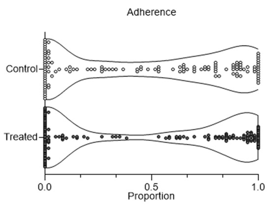Healthy: The analysis showed that the variable ‘Healthy’ was significantly influenced by adherence, with F(2, 264) = 321.403, p < 0.001, and a partial eta squared (η2) of 0.709, indicating a large effect size. The interaction effect between adherence and Control_treated was also significant, F(2, 264) = 5.224, p = 0.006, η2 = 0.038, suggesting that the effect of adherence on ‘Healthy’ varies depending on the treatment condition.