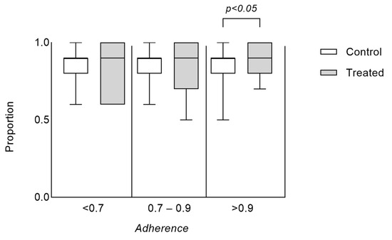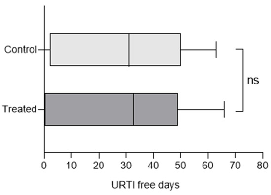 The enrolled subjects could be roughly divided into those who followed the daily intake dosage (>90%), those who followed it discontinuously (between 70 and 90%), and those who did not follow it (<70%). Participants were categorized into three adherence levels: <70%, 70–90%, and >90%. The adherence median values were 75 and 73%, respectively, from the control and treated group, showing a comparable median distribution; the first and third quartile were 10 and 95% for the control and 0 and 95% for the treated group. It is notable that the violin plot shows a strong bimodal shape distribution; indeed, enrolled subjects were either fully compliant or non-compliant. Considering the effect of treatment independently of the treatment adherence itself, it can be observed that the disease-free days in the upper respiratory tract were 75 and 73% of the days (see Figure 3); this proportion is not significant (t-test; p > 0.05).