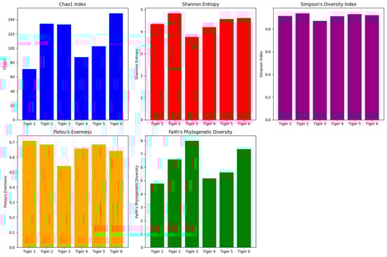 Bar plots illustrating the alpha diversity indices (Chao1, Shannon Entropy, Simpson’s Diversity Index, Pielou’s Evenness, and Faith’s Phylogenetic Diversity) for the gut microbiome of six Siberian tigers.
