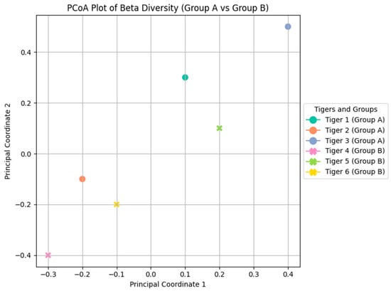 PCoA plot illustrating the beta diversity analysis comparing Group A (Tigers 1, 2, and 3) and Group B (Tigers 4, 5, and 6) based on Bray–Curtis dissimilarity.