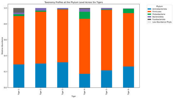 Stacked bar plot depicting the relative abundance of microbial communities at the phylum level across the six Siberian tigers.