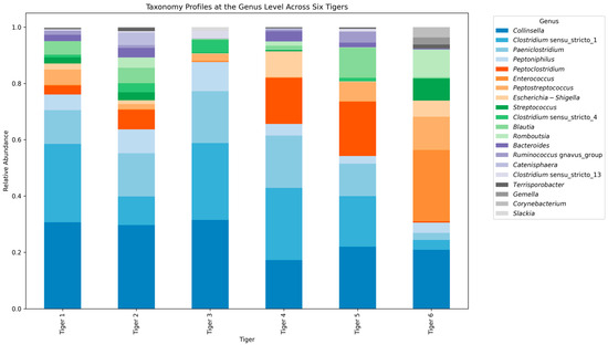 At the genus level, Clostridium sensu stricto (19.5%) was the most dominant genus across all tigers, particularly abundant in Tigers 2 and 6 (Figure 4), while Escherichia-Shigella was more prevalent in Tiger 3. Unclassified reads at the genus level ranged from 0% to 0.57%, with Tiger 1 exhibiting the highest percentage.
