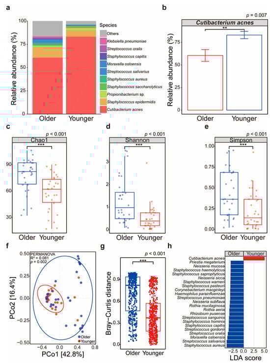 Age-related differences in diversity and dominance of the skin bacterial community. (a) Relative abundance of bacterial species in older and younger groups. The color-coded bars represent specific bacterial species. (b) Relative abundance of Cutibacterium acnes in older and younger groups. (c) Chao1 diversity index comparison between older and younger groups. (d) Shannon diversity index comparison between older and younger groups. (e) Simpson diversity index comparison between older and younger groups. (f) Principal coordinate analysis (PCoA) plot based on Bray–Curtis distances, illustrating the separation of bacterial communities between the older and younger groups. (g) Bray–Curtis distances within the older group and within the younger group, respectively, illustrating intra-group microbial community differences. (h) Linear discriminant analysis effect size identifying significant bacterial biomarkers in older and younger groups. Stars denote the level of significance (unpaired t-test; ** p-value < 0.01; *** p-value < 0.001).