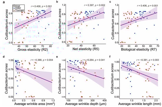 Regression plot for skin biomechanical properties significantly correlated with Cutibacterium acnes. Correlation between C. acnes abundance and (a) gross elasticity, (b) net elasticity, (c) biological elasticity, (d) average wrinkle area, (e) average wrinkle depth, and (f) average wrinkle length.