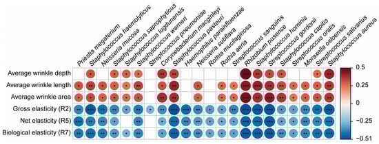Correlation heatmap of skin biomechanical properties and biomarkers in older individuals. Heatmap of correlations between skin biomechanical properties and biomarkers in the older group. Heatmap illustrating the correlations between the 22 biomarkers identified in the older group and various skin biomechanical properties, including gross, net, and biological elasticities, average wrinkle area, depth, and length. Each cell in the heatmap represents the strength and direction of the correlation, with significant positive correlations in blue and significant negative correlations in red. The biomarkers include species such as Staphylococcus aureus, Staphylococcus haemolyticus, and Rhizobium pusense (* p < 0.05, ** p < 0.01, *** p < 0.001).