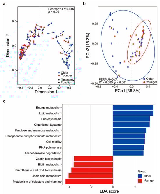 Differences in functional profiles between age groups. (a) Procrustes analysis showing congruence between the taxonomic and functional compositions of the microbiome. The statistically significant Pearson correlation indicates that microbiomes had similar taxonomic composition and functions. (b) PCoA based on functional profiles, illustrating distinct differences between the younger and older groups. (c) Linear discriminant analysis scores of functional pathways enriched in each group.