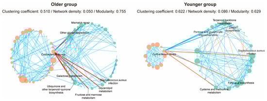 Network analysis elucidates complex biological systems through interactions within bacterial communities []. It provides insights into the ecological relationships between C. acnes and other bacterial species. The bacterial network in the younger group exhibited higher connectivity and interactions, suggesting a more stable and resilient community. In contrast, the older group’s network showed higher modularity, indicating more independent and specialized communities. Network analysis highlighted differential ecological relationships between C. acnes and various metabolic functions across age groups. Only ‘Staphylococcus aureus infection’ was negatively correlated with C. acnes in both groups, while other pathways differed. The findings suggest that aging affects correlations among key bacterial species and their functional roles. The structural differences in these microbial networks reflect functional changes and adaptations that could impact skin health with age.