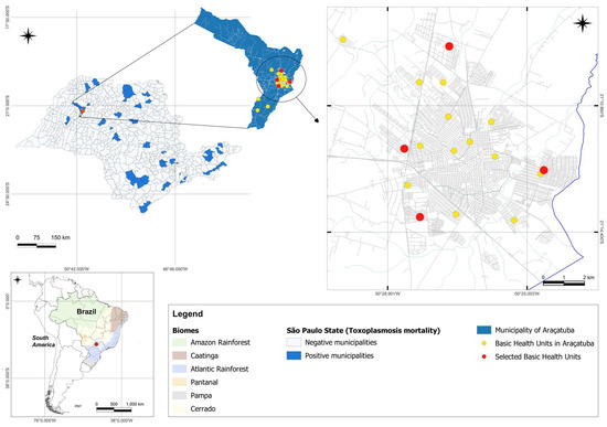 - Lima, M.L.F.; Sousa, A.M.A.F.L.S.d.; Marques, L.L.; Ferreira, I.B.; Giuffrida, R.; Kmetiuk, L.B.; Biondo, A.W.; Santarém, V.A. Household Location (Urban, Peri-Urban and Rural Settlements) as an Associated Risk Factor for Toxoplasmosis during Pregnancy in Southeastern Brazil. Trop. Med. Infect. Dis. 2024, 9, 173. [Google Scholar] [CrossRef] [PubMed]