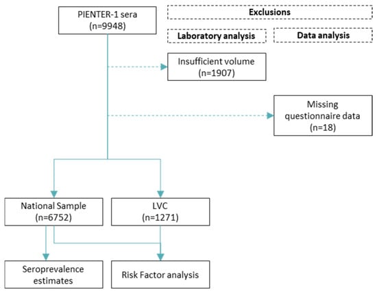 Upon addition of the questionnaire data to the laboratory results of the PIENTER-1 participants, 18 participants were excluded due to absent questionnaire data (Figure 1). Of the included participants, 6752 were in the national sample and 1271 were in the LVC.