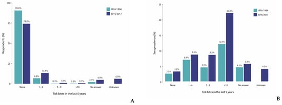 Self-reported tick bites in the last 5 years in 1995/1996 (green) and 2016/2017 (purple). (A) Tick bites reported by the participants; (B) Seroprevalence per reported tick bite frequency.