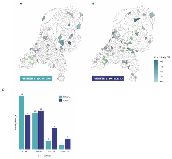 In the Netherlands, the first national biobank for population-based cross-sectional seroprevalence studies (PIENTER-1) was established in 1995/1996 []. The biobank includes a national sample drawn from eight randomly selected municipalities in each of five geographic regions in the Netherlands. From each of these 40 municipalities, an age-stratified sample was drawn from the population register. To gain insight into the effects of clusters of unvaccinated individuals on herd immunity, a separate sample was drawn from eight municipalities with low vaccination coverage (LVC) in the national immunization program. The PIENTER-1 biobank contained 9948 serum samples and questionnaires from participants in the national sample (n = 8359) and the LVC (n = 1589).