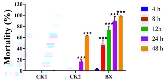 The mortality rate of Meloidogyne incognita caused by the fermentation broth of strain BX-1 at various time intervals. CK1: sterile water; CK2: sterile LB liquid medium. BX: Strain BX-1 fermentation broth *** p < 0.001.