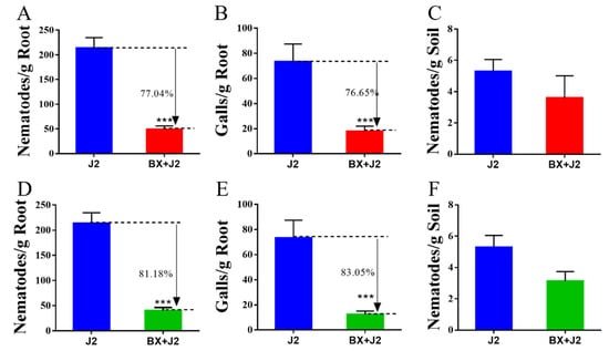 The biocontrol efficiency of strain BX-1: (A,D) Nematodes in root; (B,E) Galls of root; (C,F) Nematodes in root; four treatments were set up in this experiment, with five replicates for each treatment; (A–C) Apply fermentation broth before inoculating M. incognita; (E,F) Fermentation broth was added after 17 days after inoculation with M. incognita. *** p < 0.001.