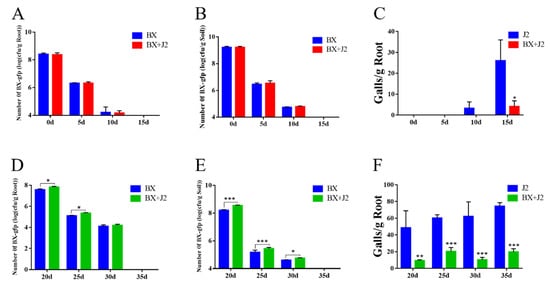 Colonization of strain BX-1: (A,D) Colonization of strain BX in tomato roots; (B,E) Colonization of strain BX in tomato rhizosphere soil; (C,F) Root-knot nematode infestation; (A–C) Apply fermentation broth before inoculating root-knot nematodes; (D–F) Inoculated with root-knot nematodes for 17 days. (A–C) Apply fermentation broth before inoculating M. incognita; (D–F) Fermentation broth was added again after 17 days of inoculation with M. incognita. Four treatments were set up in this experiment, with five replicates for each treatment. * p < 0.05, ** p < 0.01, *** p < 0.001.
