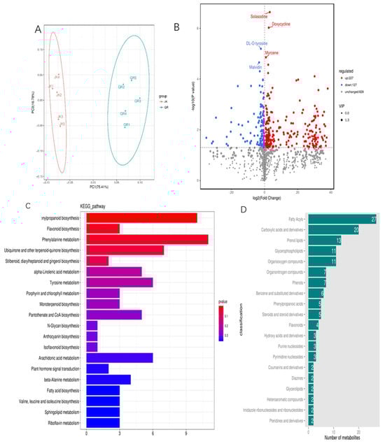 Metabolome analysis of tomato root exudates: (A) Principal component analysis; (B) Differential metabolite volcano map; (C) KEGG classification; (D) HDMB classification. JK: exudates of healthy tomato root; QR: exudates of M. incognita infested tomato root. In this experiment, two treatments were set up with 10 replicates each. KEGG: Kyoto Encyclopedia of Genes and Genomes; HDMB: Human Metabolome Database.