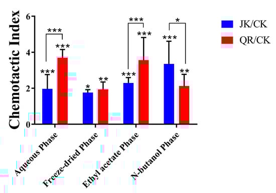 As illustrated in Figure 5, the chemotaxis of strain BX-1 to the aqueous phase samples was significantly enhanced after infestation with root-knot nematodes compared to healthy plants. The active components were predominantly found in the ethyl acetate phase of the root secretions, while the n-butanol phase samples exhibited chemotaxis to BX-1. It is worth noting that strain BX-1 displayed chemotactic behavior towards both healthy and root-knot nematode-infested tomato root secretions.