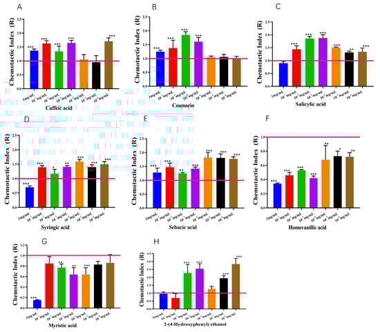 The chemotaxis of strain BX-1 to differential metabolites: (A) caffeic acid; (B) coumain (C) salicylic acid; (D) syeingic acid; (E) sebacic acid; (F) homovanillic acid; (G) myristic acid; (H) 2-(4-Hydroxyphenyl) ethanol. Three replicates were performed for each strain, and the experiments were repeated three times. * p < 0.05, ** p < 0.01, *** p < 0.001.